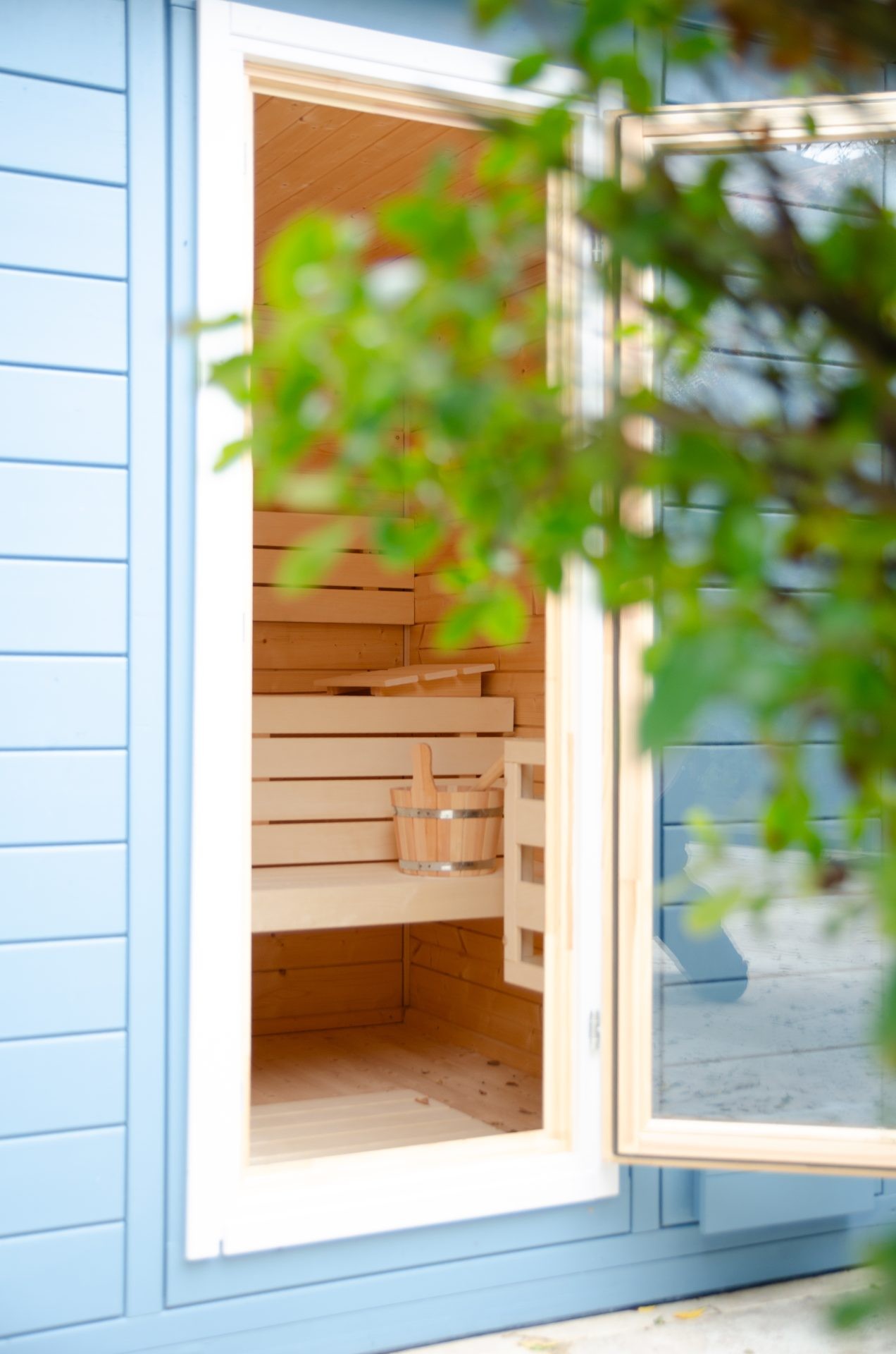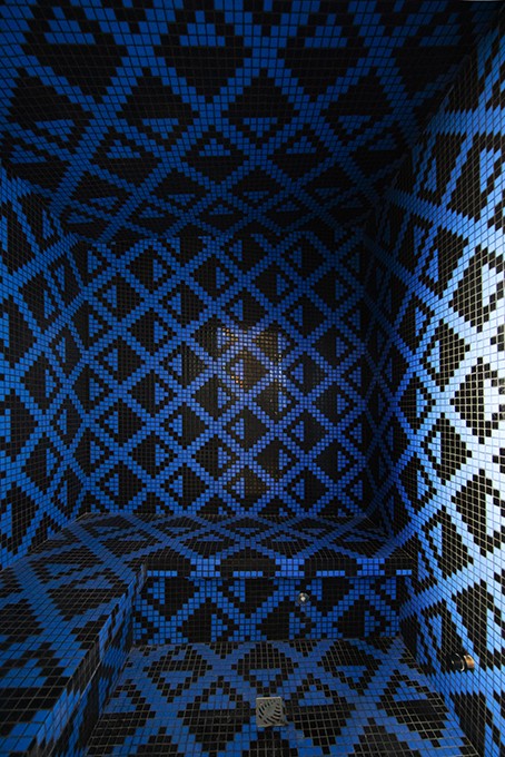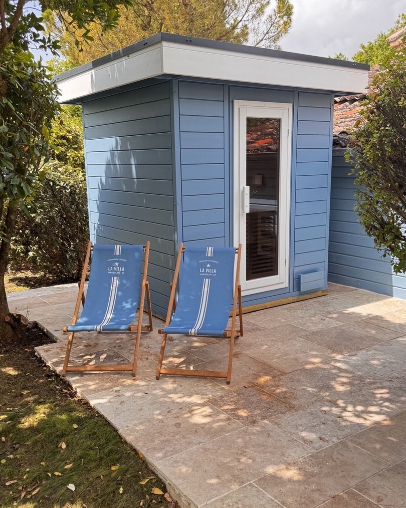 The hammam, clad in blue and black ceramic, is directly accessible from the living room. A shower is available nearby. The sauna is located on the terrace opposite the entrance to the Villa. A relaxation area is set up close by.