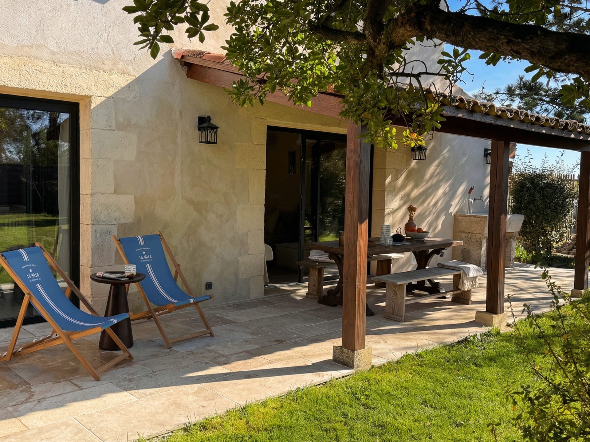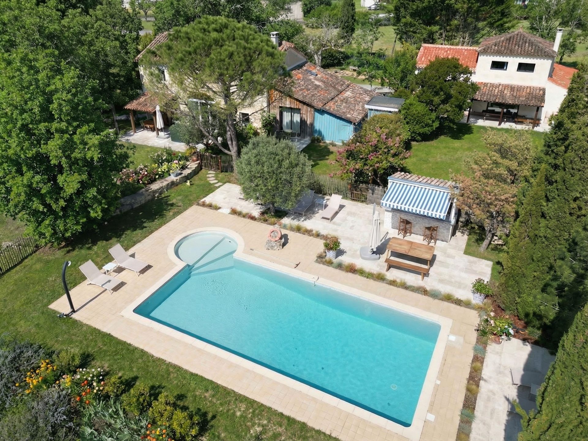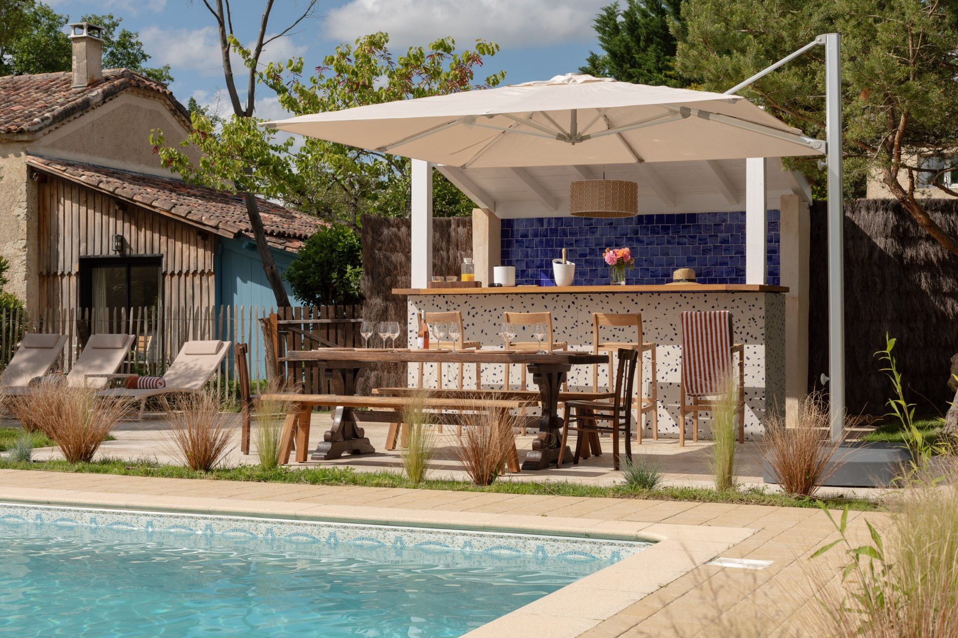 Just a few steps from the two houses, the pool has a world of its own, with its Pool bar (fridge, induction hobs, sink, coffee machine, secure outdoor glassware), its pergola dressed with white curtains concealing an outdoor massage bed, and its elegant sun loungers. Morning coffee, lunch in the sun or sunset drinks — it is easy to grow attached to this place. Pool towels are, of course, provided.