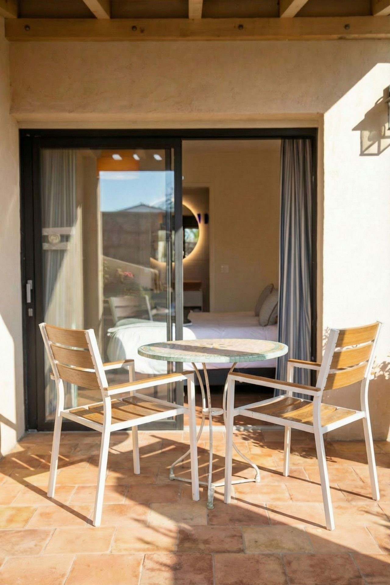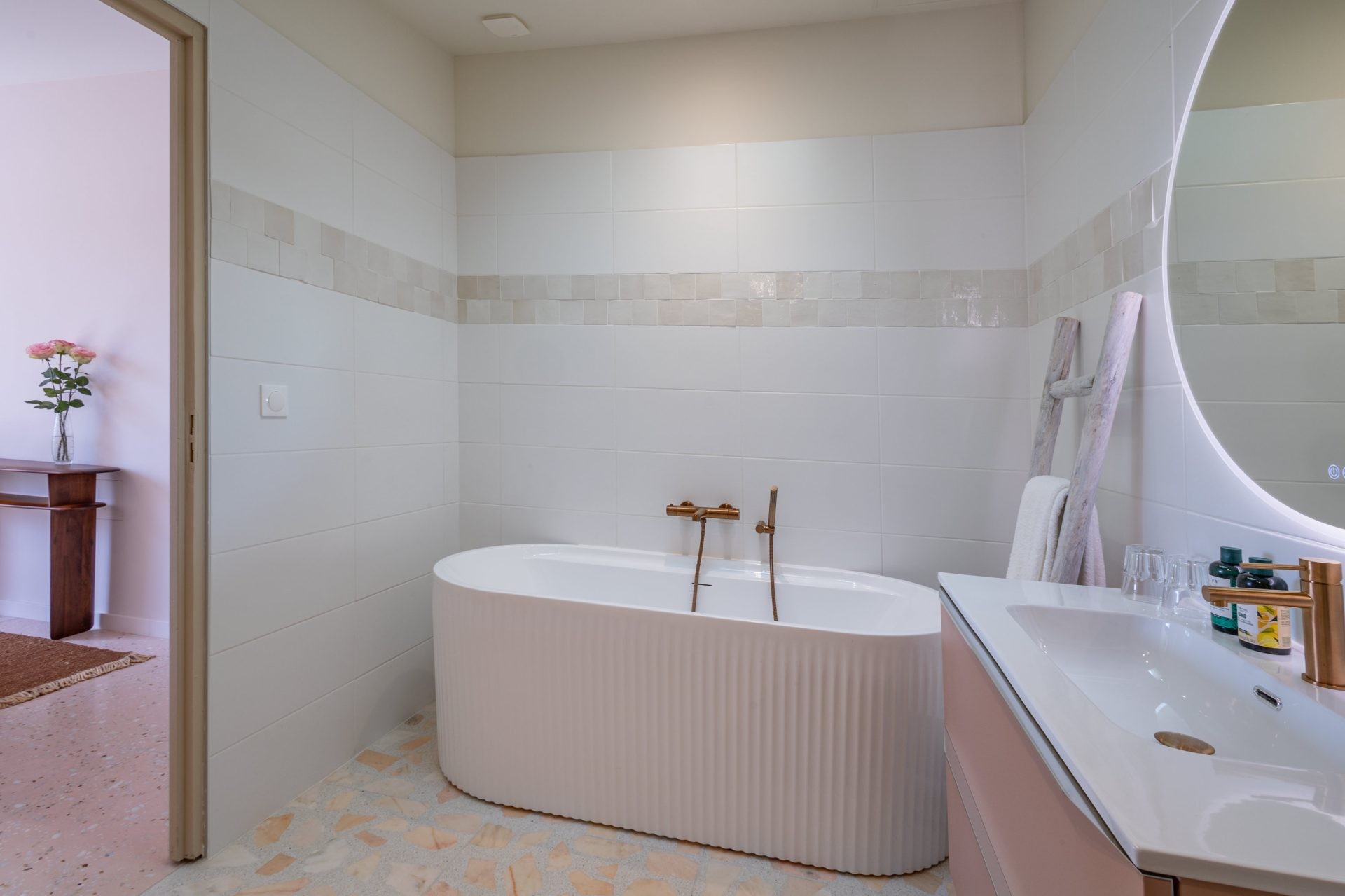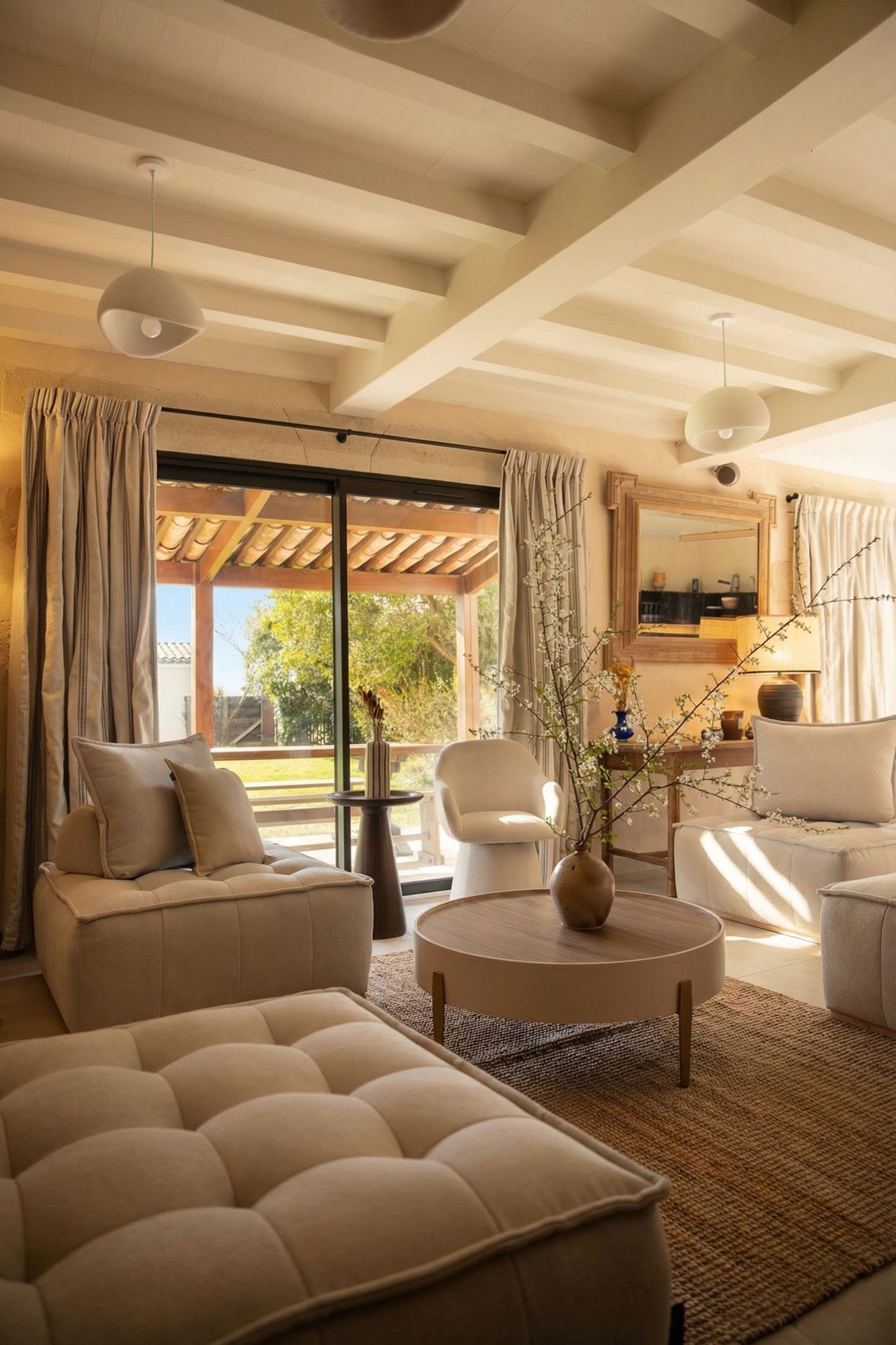 Just a few steps from the two houses, the pool has a world of its own, with its Pool bar (fridge, induction hobs, sink, coffee machine, secure outdoor glassware), its pergola dressed with white curtains concealing an outdoor massage bed, and its elegant sun loungers. Morning coffee, lunch in the sun or sunset drinks — it is easy to grow attached to this place. Pool towels are, of course, provided.