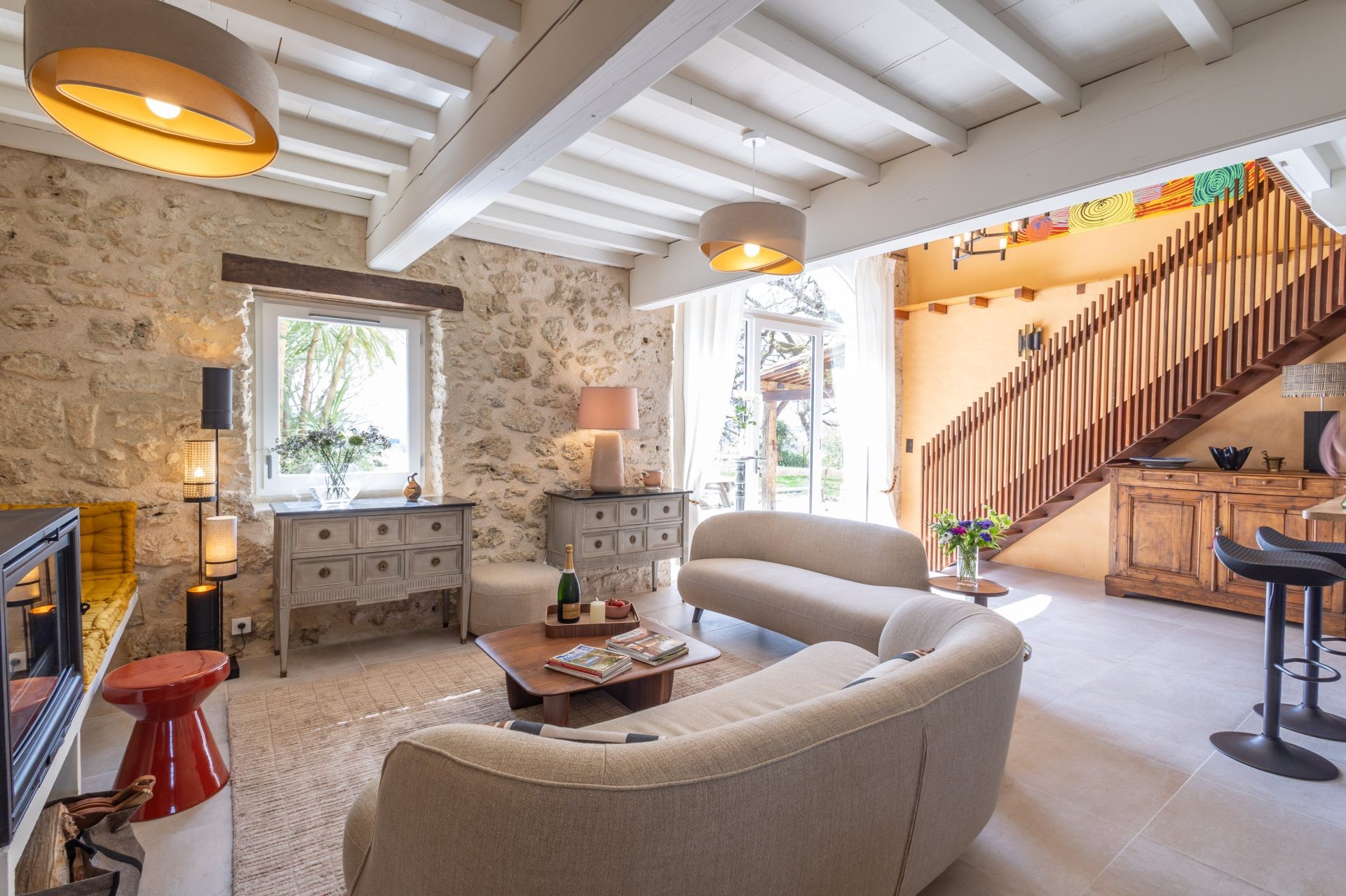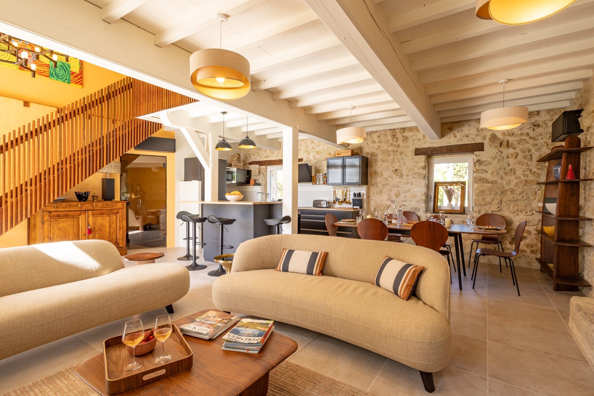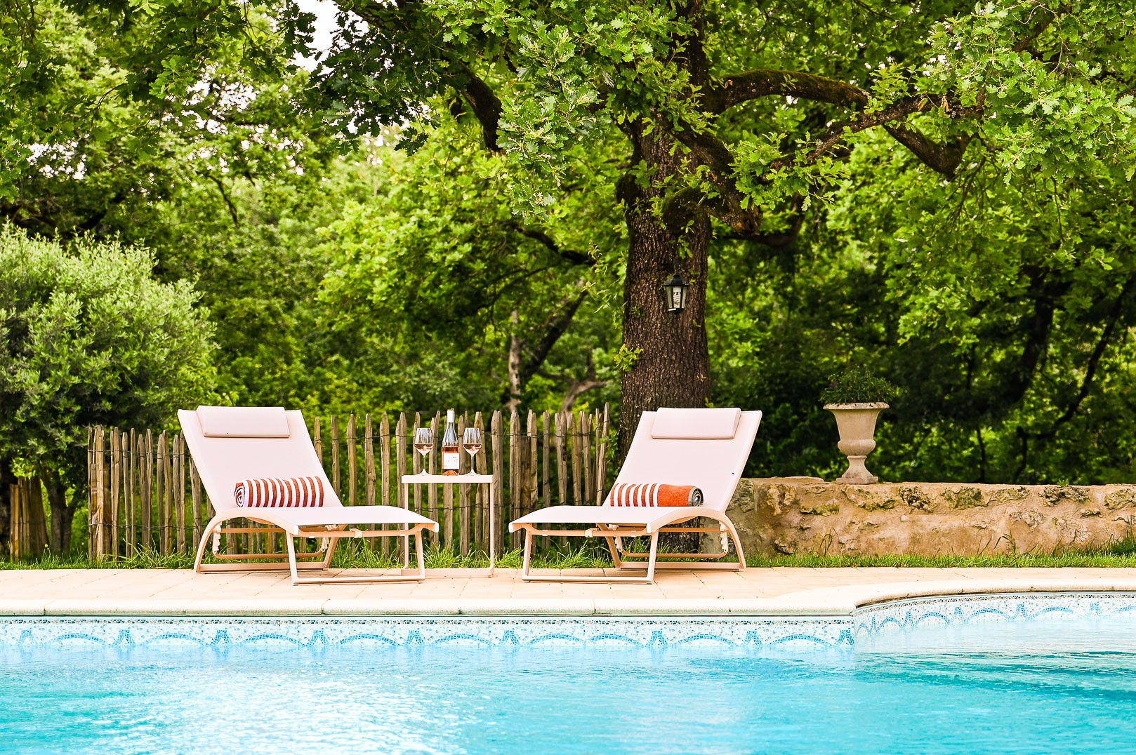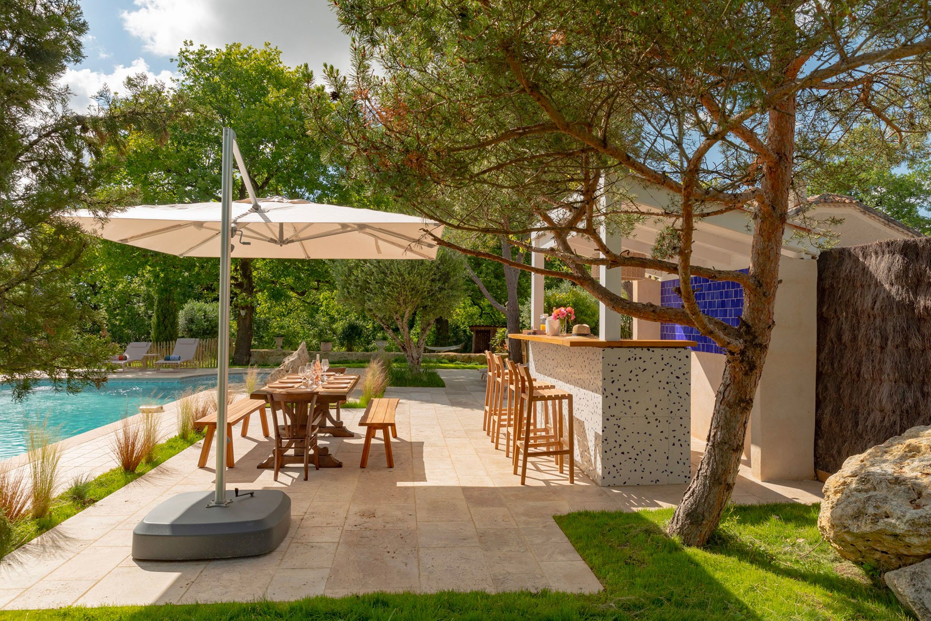 The Mas Gascon, its Villa, its Spa and its Pool form the heart of the estate. The whole combines contemporary design with the authenticity of old stone buildings, some dating back to 1776. The houses are tastefully furnished. Particular care is given to every detail to make your stay even more enjoyable. Numerous amenities are graciously available for your exclusive use: electric charging station, saltwater pool with panoramic views, pool bar, 4 terraces, a hidden spot for private conversations, hammock, sauna, hammam, massage and relaxation room… pétanque court, cinema room, telescope, plancha…